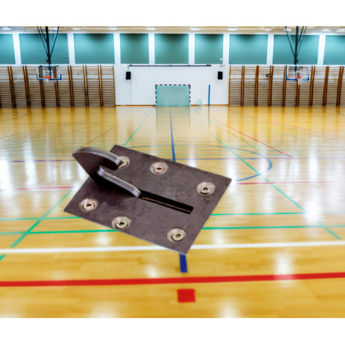 Крепление для гимнастических снарядов к полу "Лягушка" обеспечивает надежную установку гимнастического оборудования и снарядов на расстяжках.