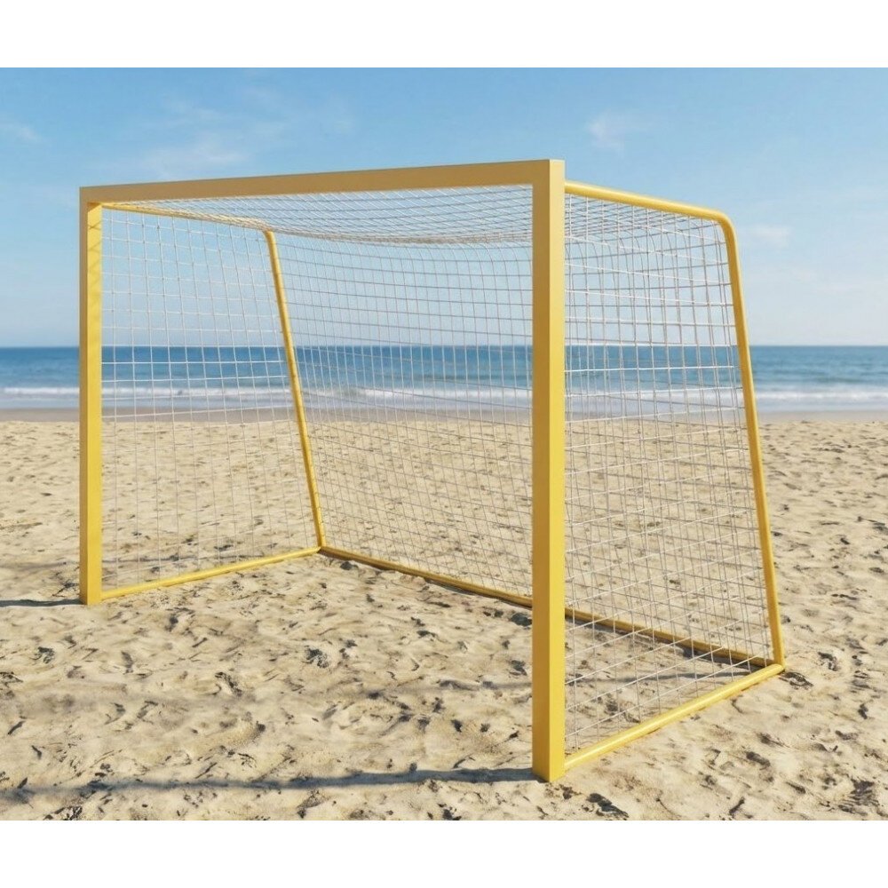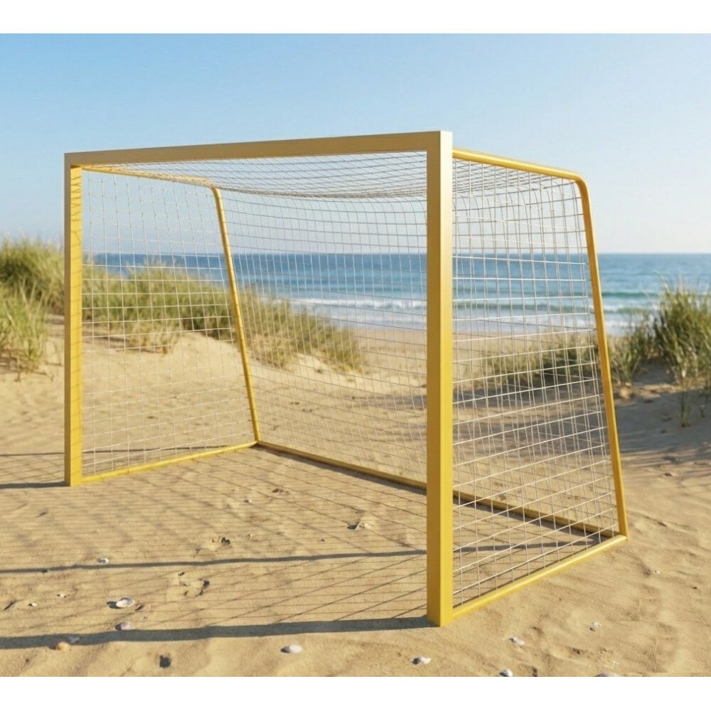 Профессиональный комплект легких и долговечных алюминиевых ворот для пляжного мини-футбола и гандбола, предназначенный для надежной установки на песчаных площадках.